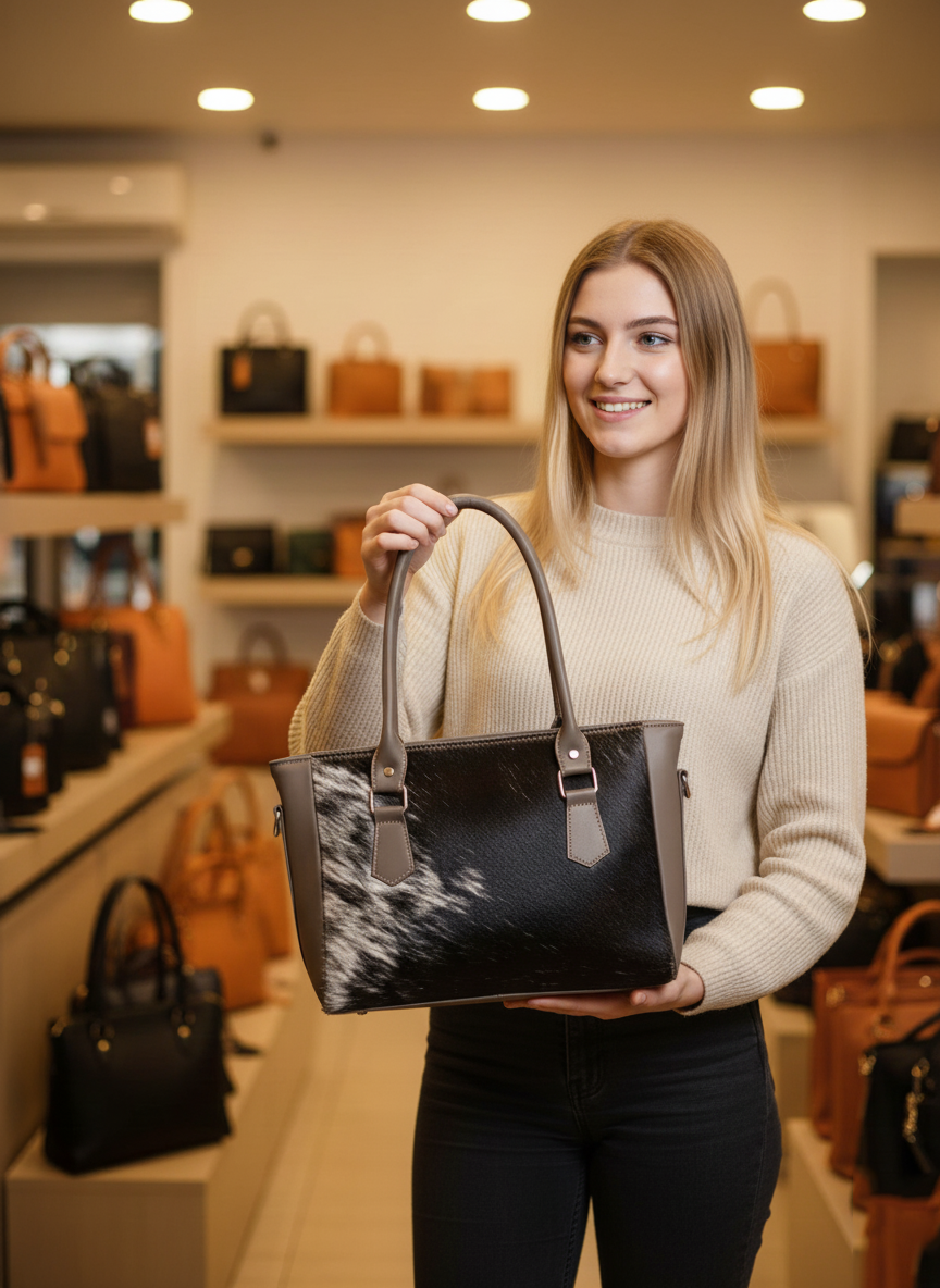 This is an attractive and versatile tote-style handbag featuring a striking hair-on-hide panel complemented by solid leather.