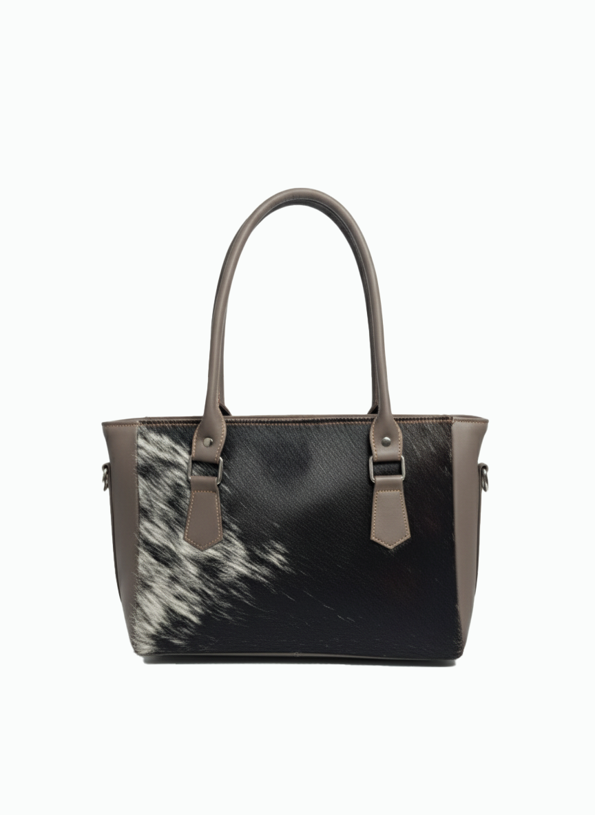 Material and Design: The bag's main body showcases a central panel of genuine hair-on-hide with a natural, irregular white, brown, and black cowhide pattern. This is framed by smooth, solid grey-brown leather or leather-look material on the sides, top, and base. The contrast between the textured hide and the smooth trim creates a sophisticated look.