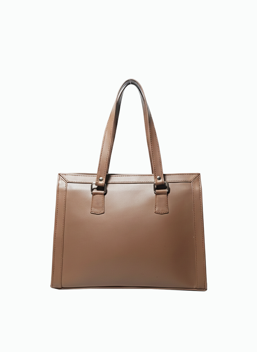 This is a medium-sized, structured tote or satchel-style handbag in a warm brown or tan color.